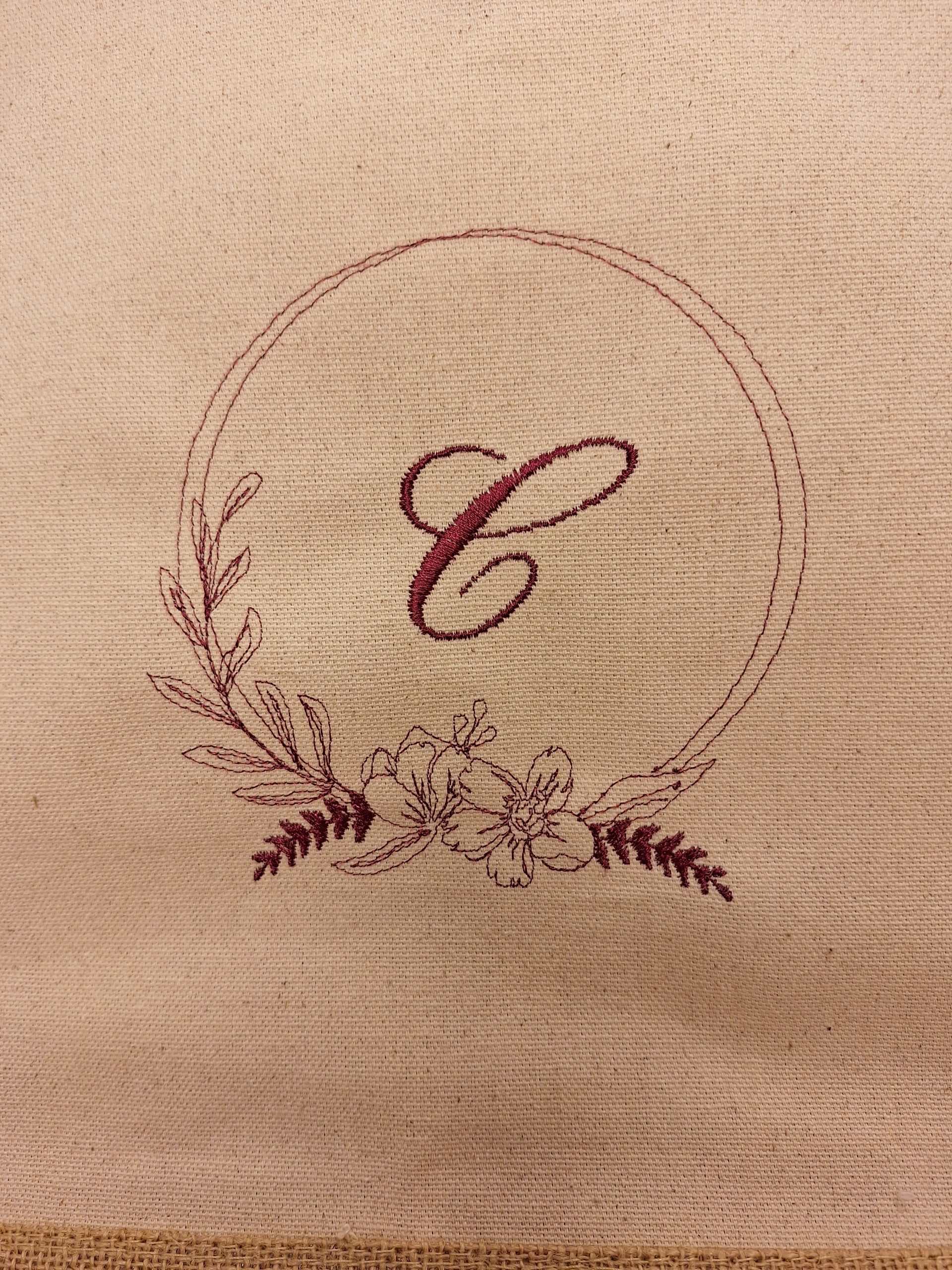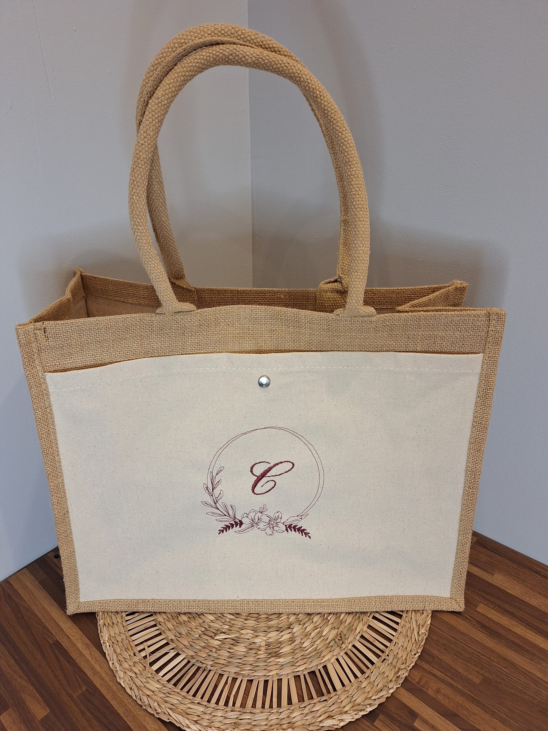 Sac en toile de jute avec poche en coton à personnalisée avec un prénom ou un cercle de fleur et initiale.