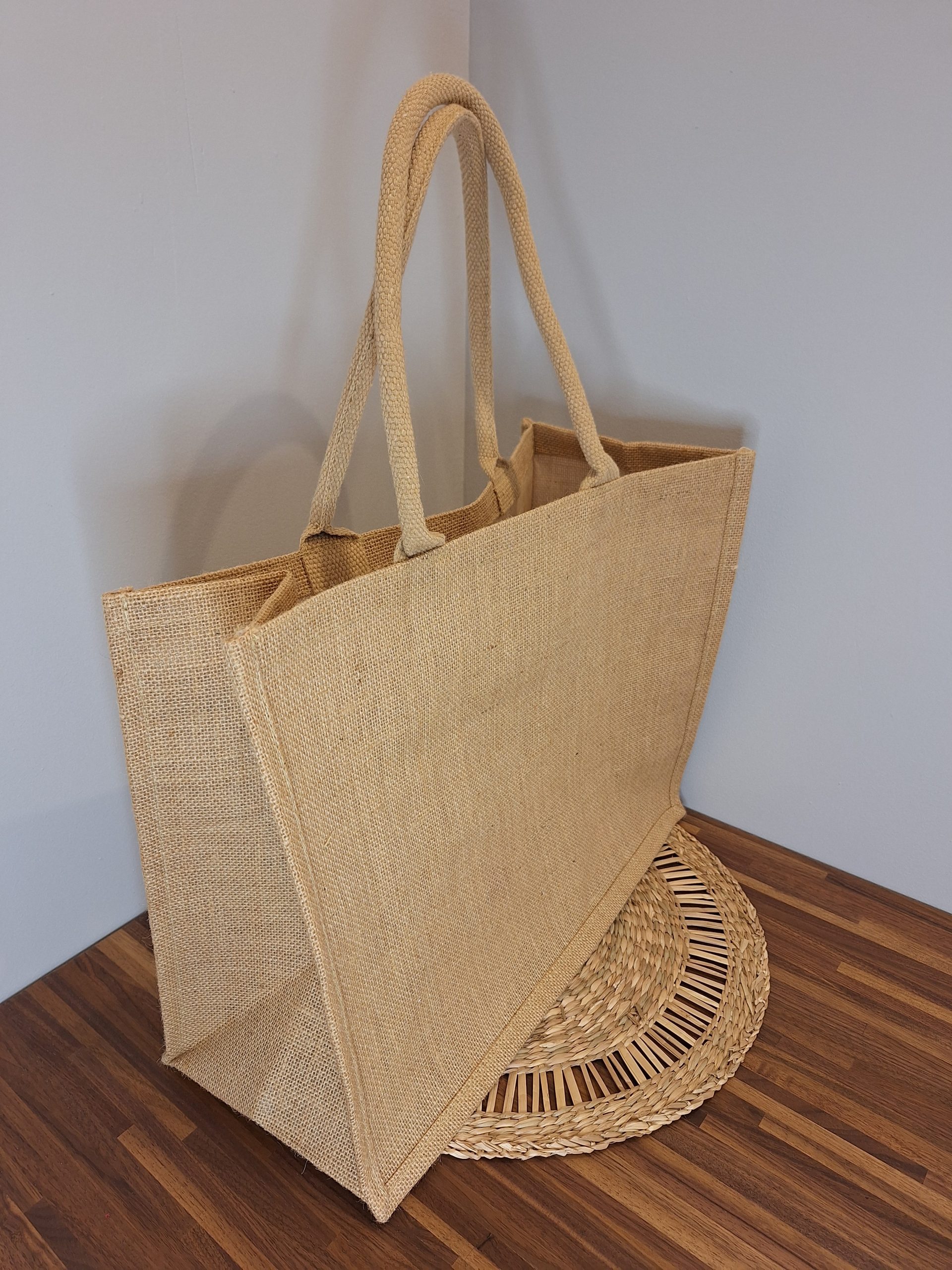 100% jute amidonnée non laminée, poche 100% coton, poignées en coton.